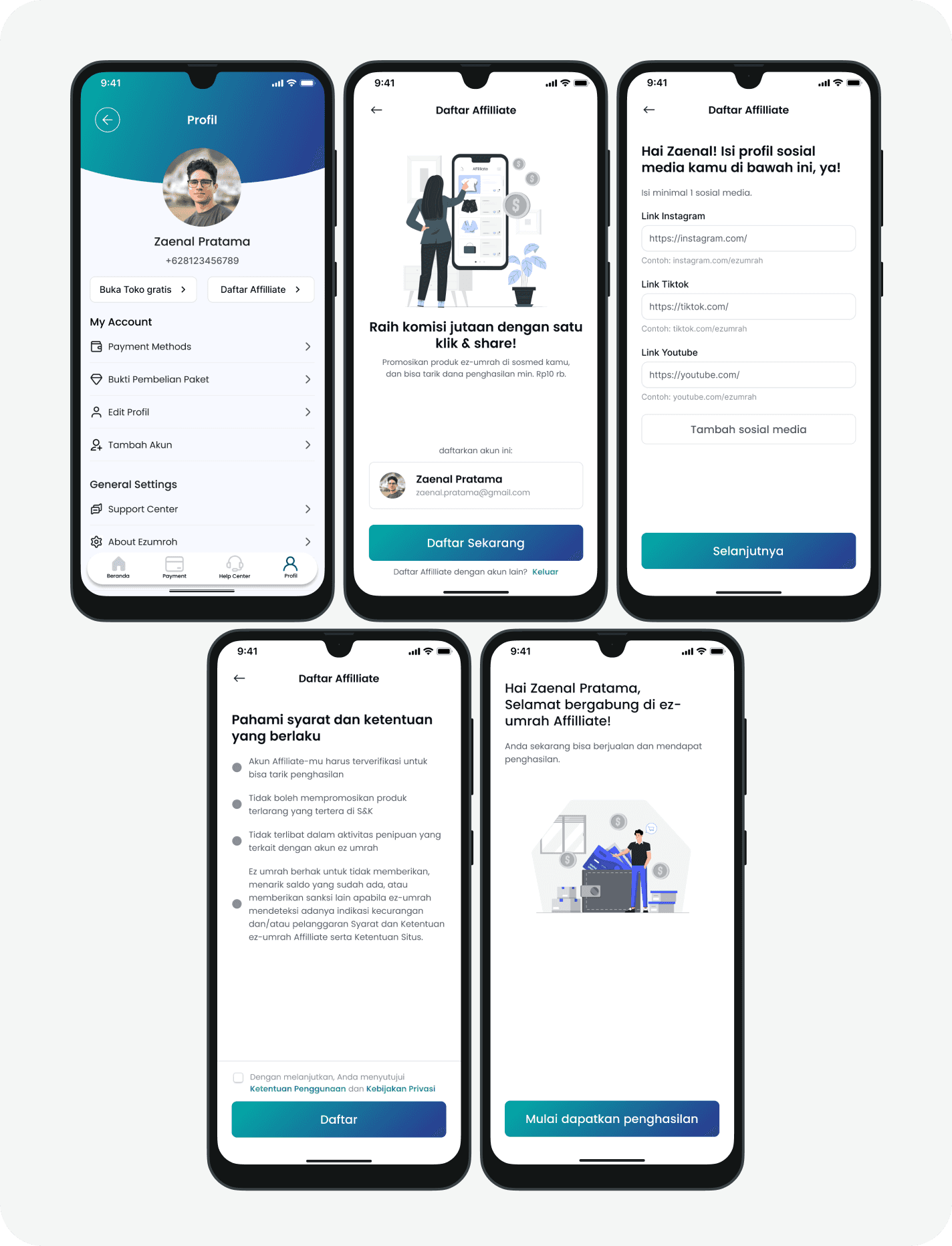 These five onboarding screens are designed to guide users through a clear, step-by-step affiliate registration process — ensuring smooth account setup, social profile input, agreement to terms, and activation.