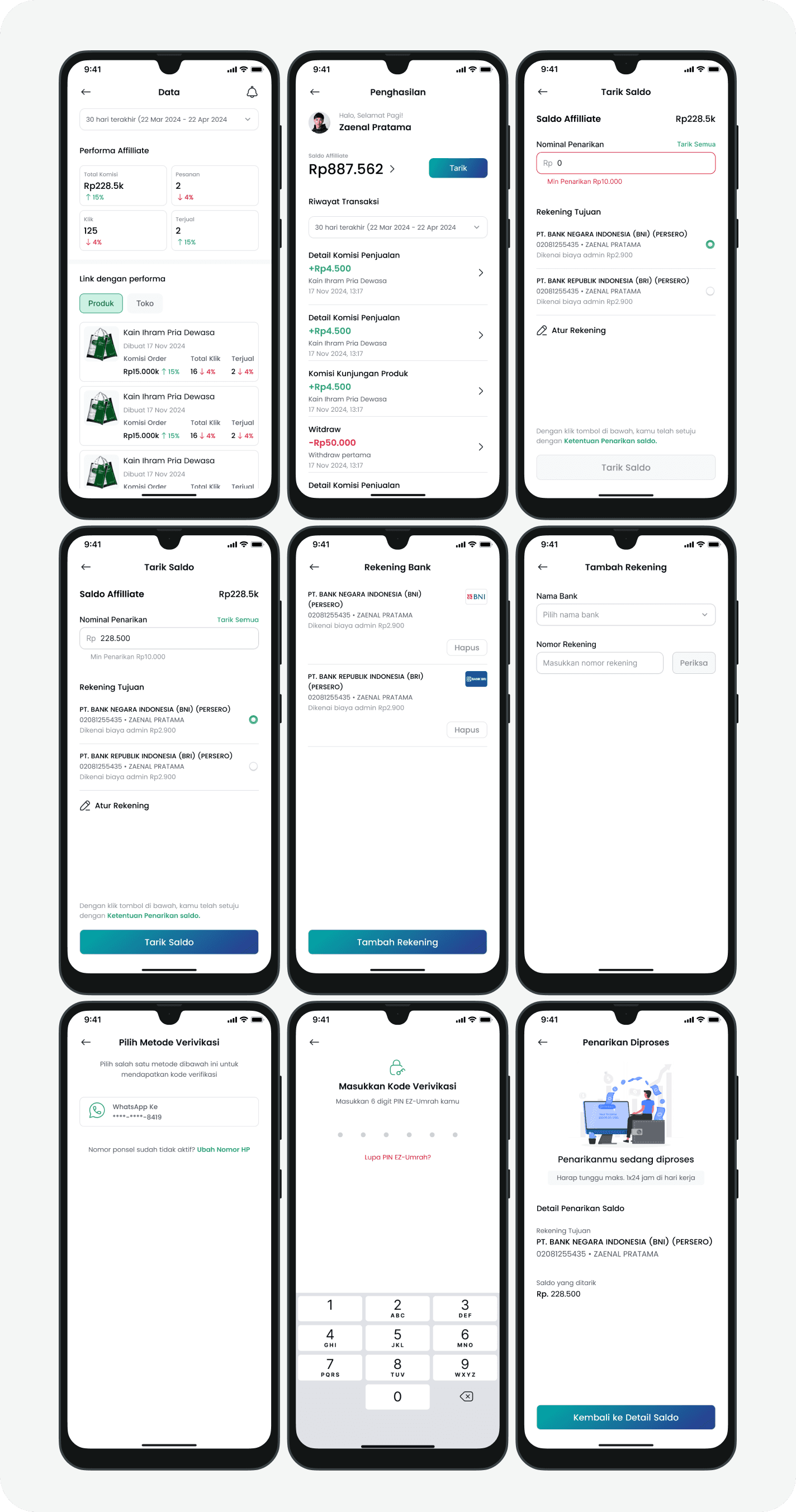 These screens are designed to give users full visibility into their affiliate earnings, detailed sales reports, and a secure, step-by-step process for managing bank accounts and withdrawing commissions.