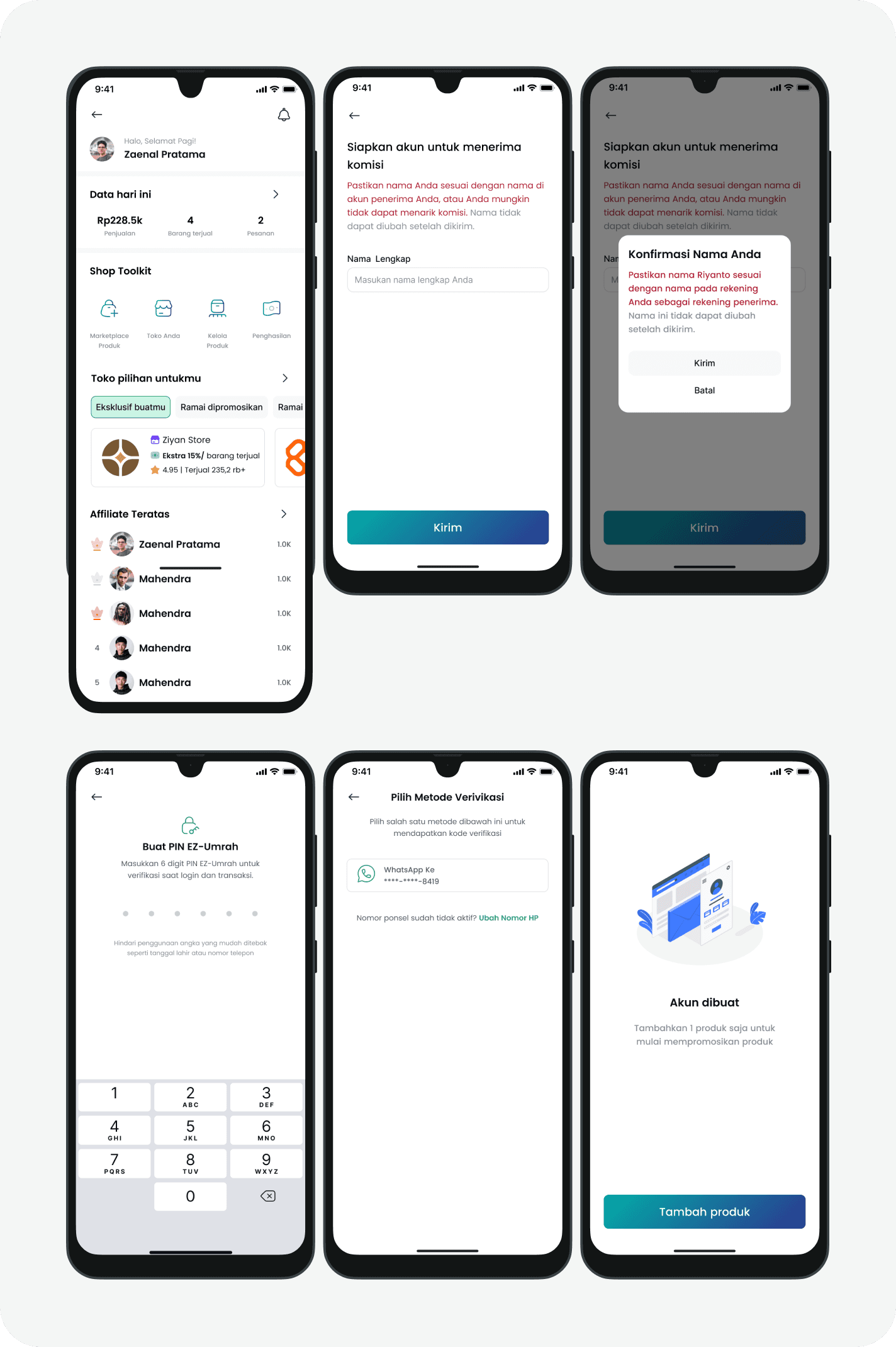 These six screens are designed to ensure a secure and reliable affiliate account setup by guiding users through profile validation, PIN creation, verification, and account activation, before starting promotions.