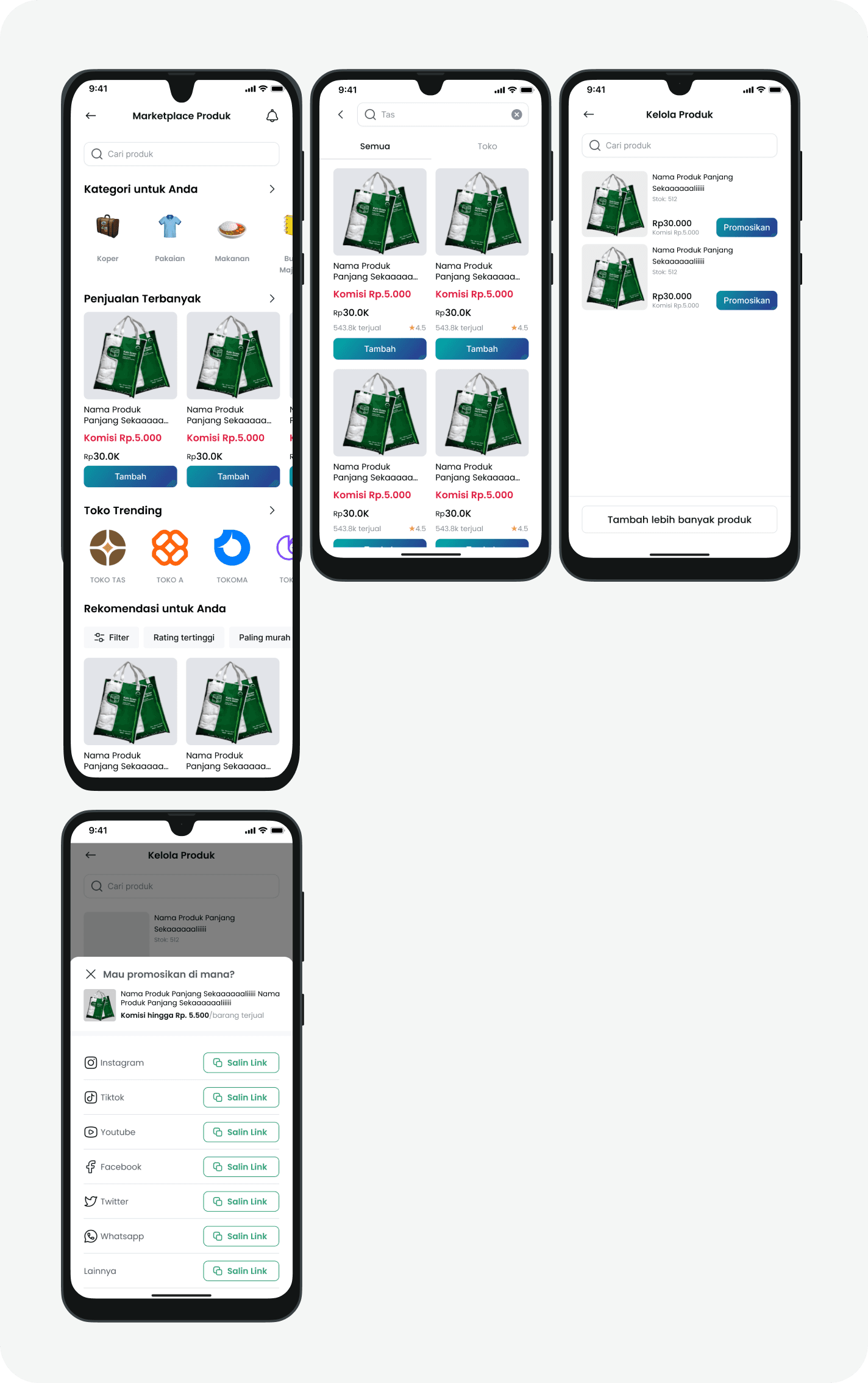 These screens are designed to help users easily explore products, select items to promote, manage their selections, and instantly generate shareable links across multiple social media platforms.