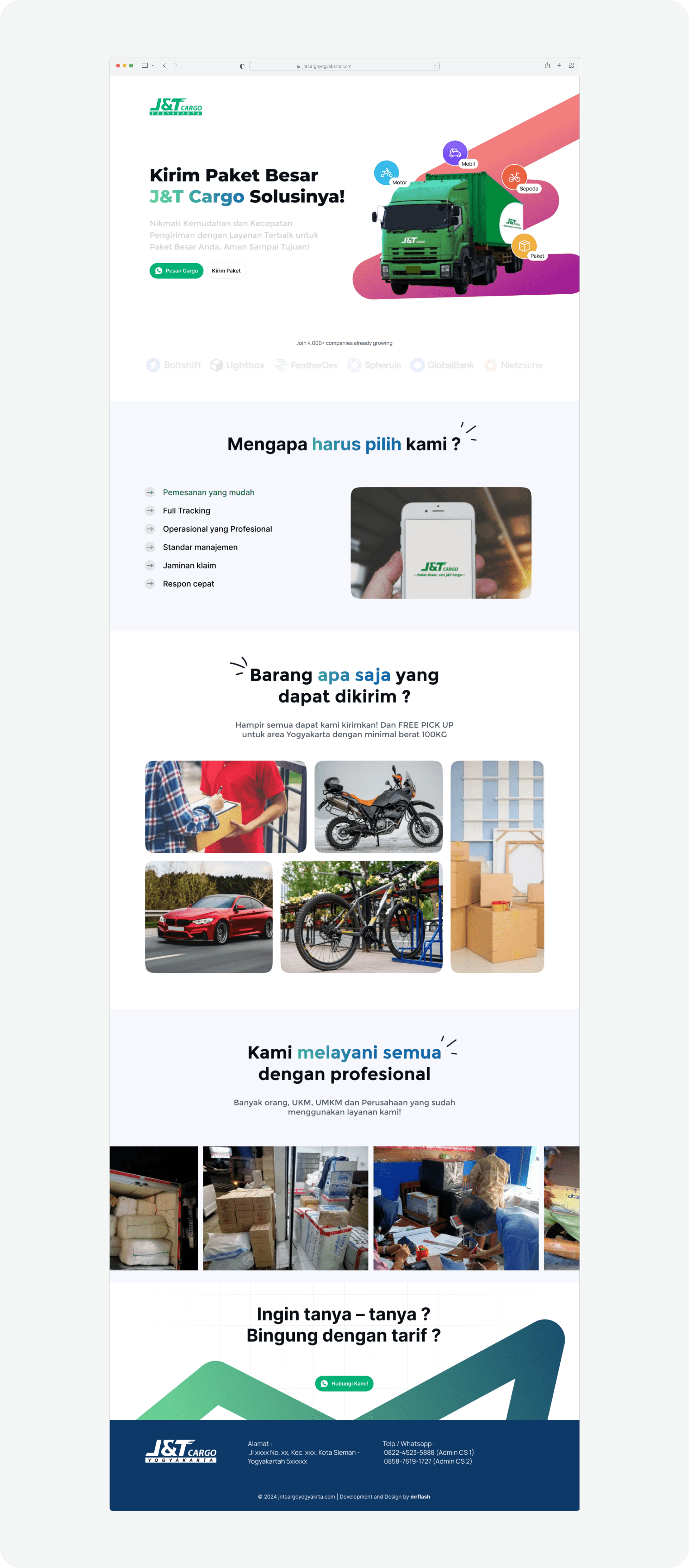JNT Cargo Yogyakarta is a clean and informative one-page landing site for J&T Cargo Yogyakarta, designed to promote large package shipping services quickly and clearly.