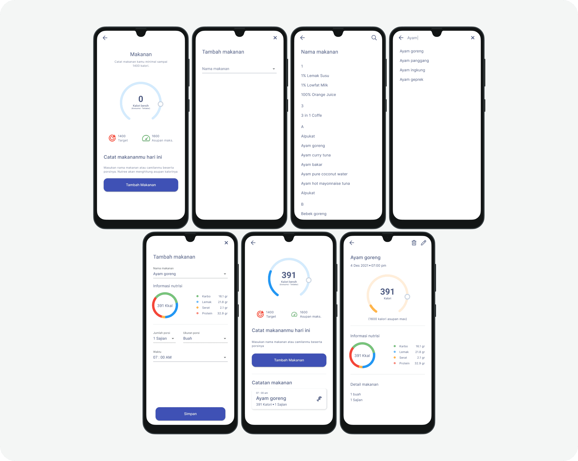 Users can search, select, and log meals with detailed nutritional info. Entries are tracked daily, with options to edit or delete.