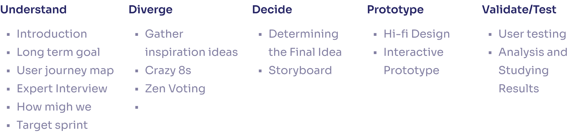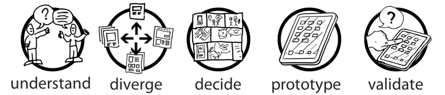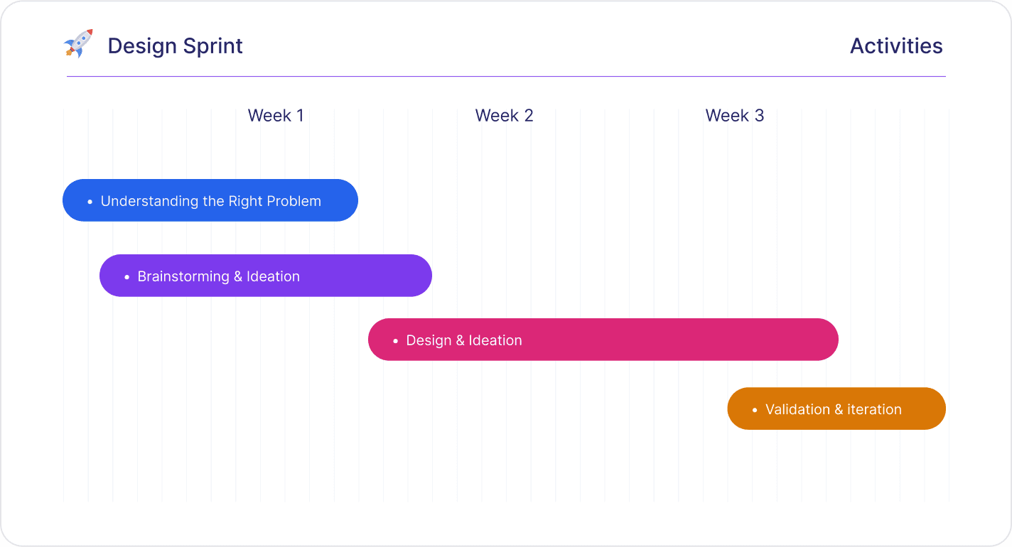 Understand, diverge and decide phase in week 1, then prototype and validate in week 2 and 3.