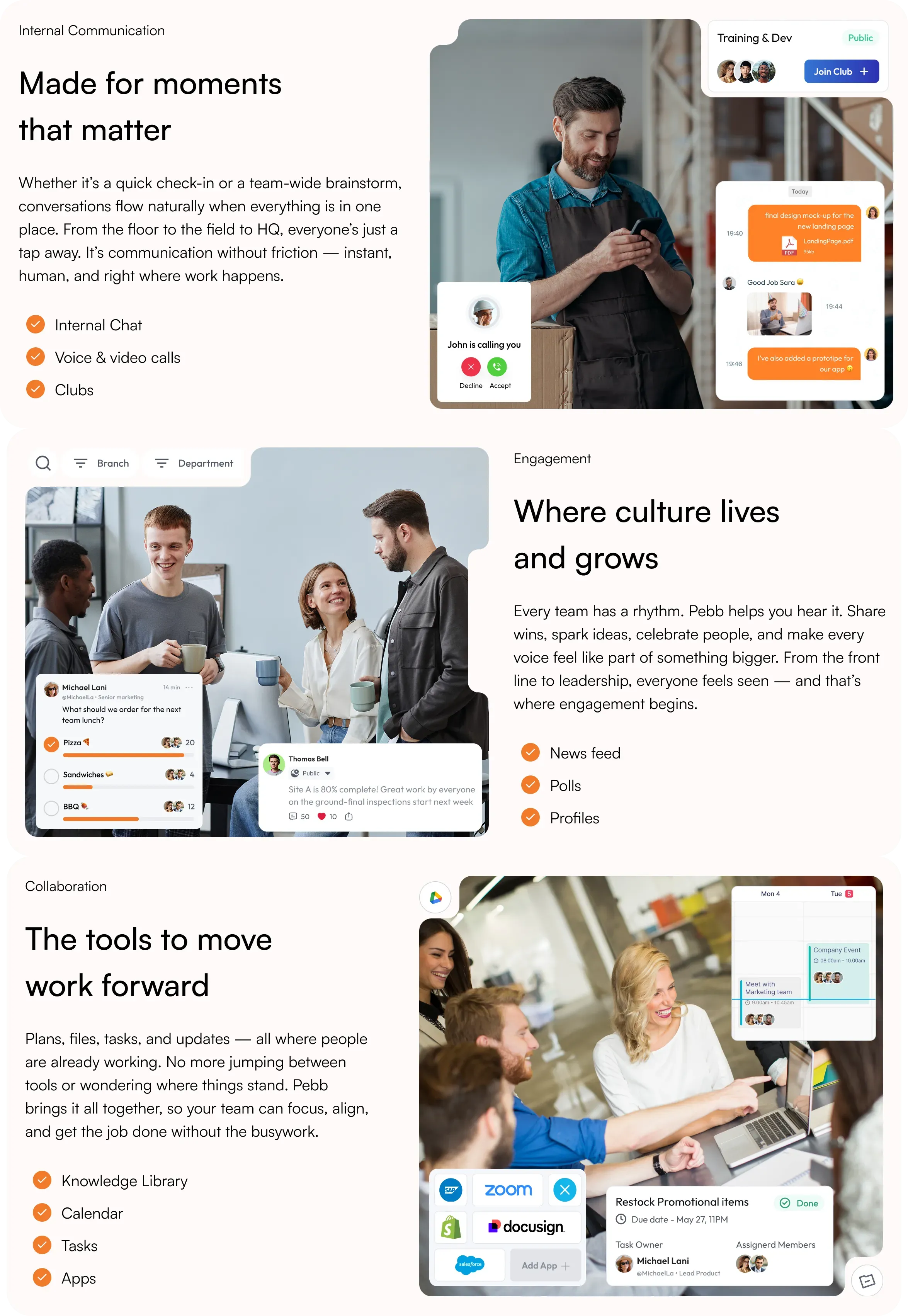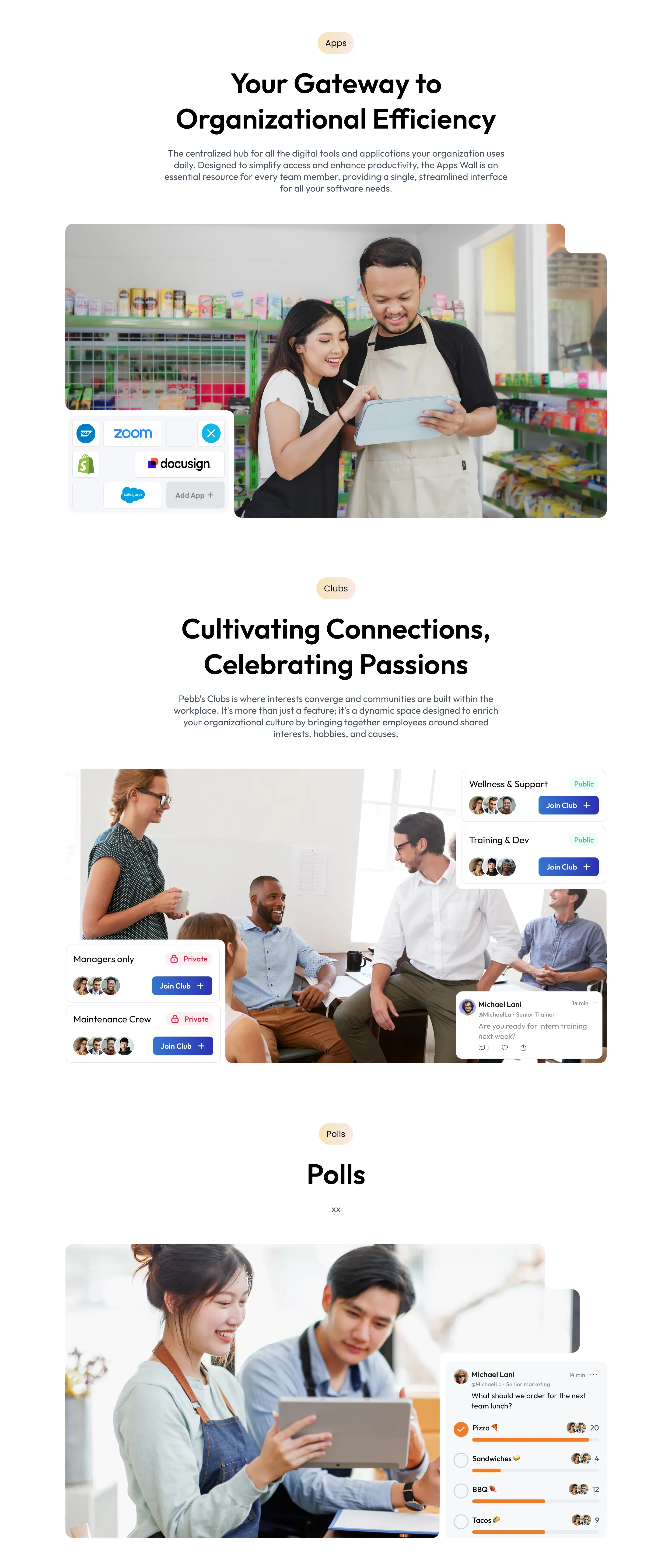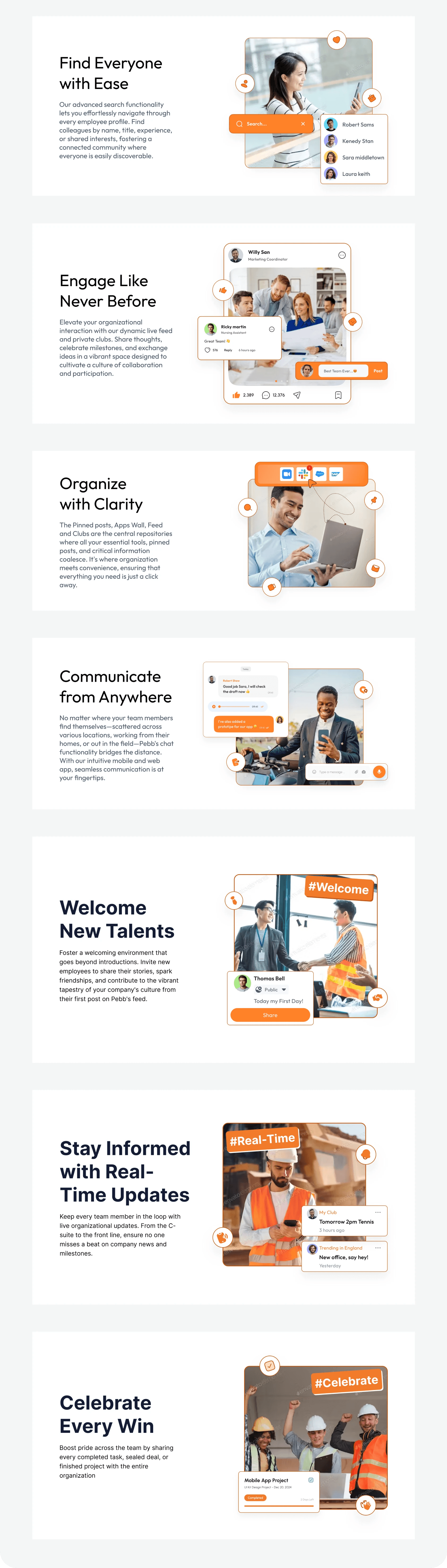 Each feature section (e.g., “Welcome New Talents”, “Engage Like Never Before”, “Celebrate Every Win”) includes a scene that combines a human-centered photo and layered UI components. I illustrated realistic mockups that highlight key functionality such as posting updates, finding coworkers, or sharing celebrations to match the copy's message.