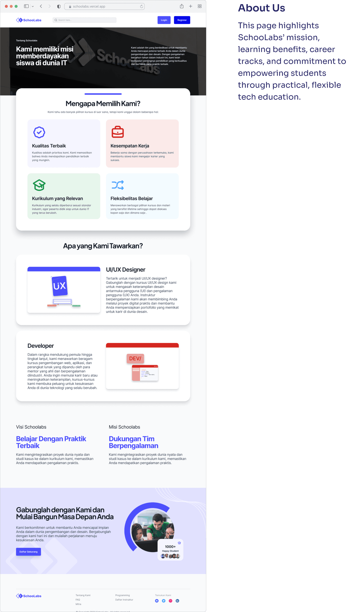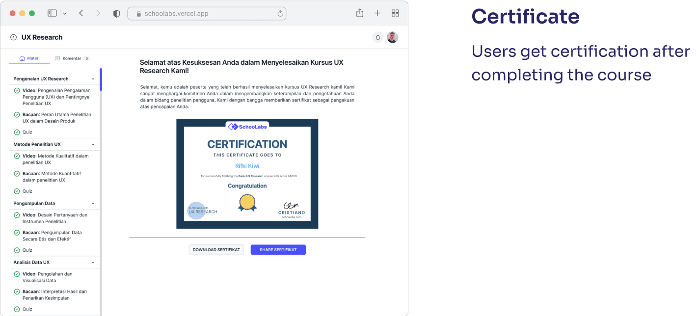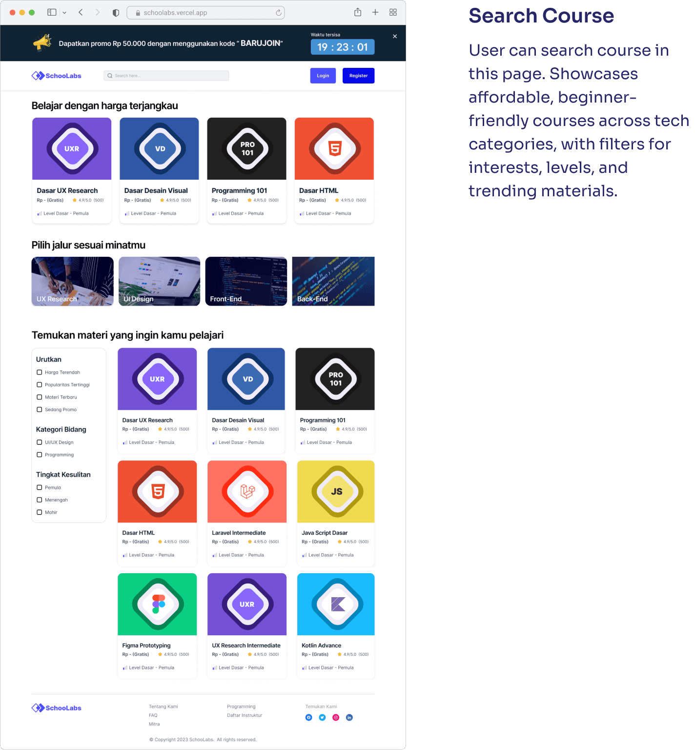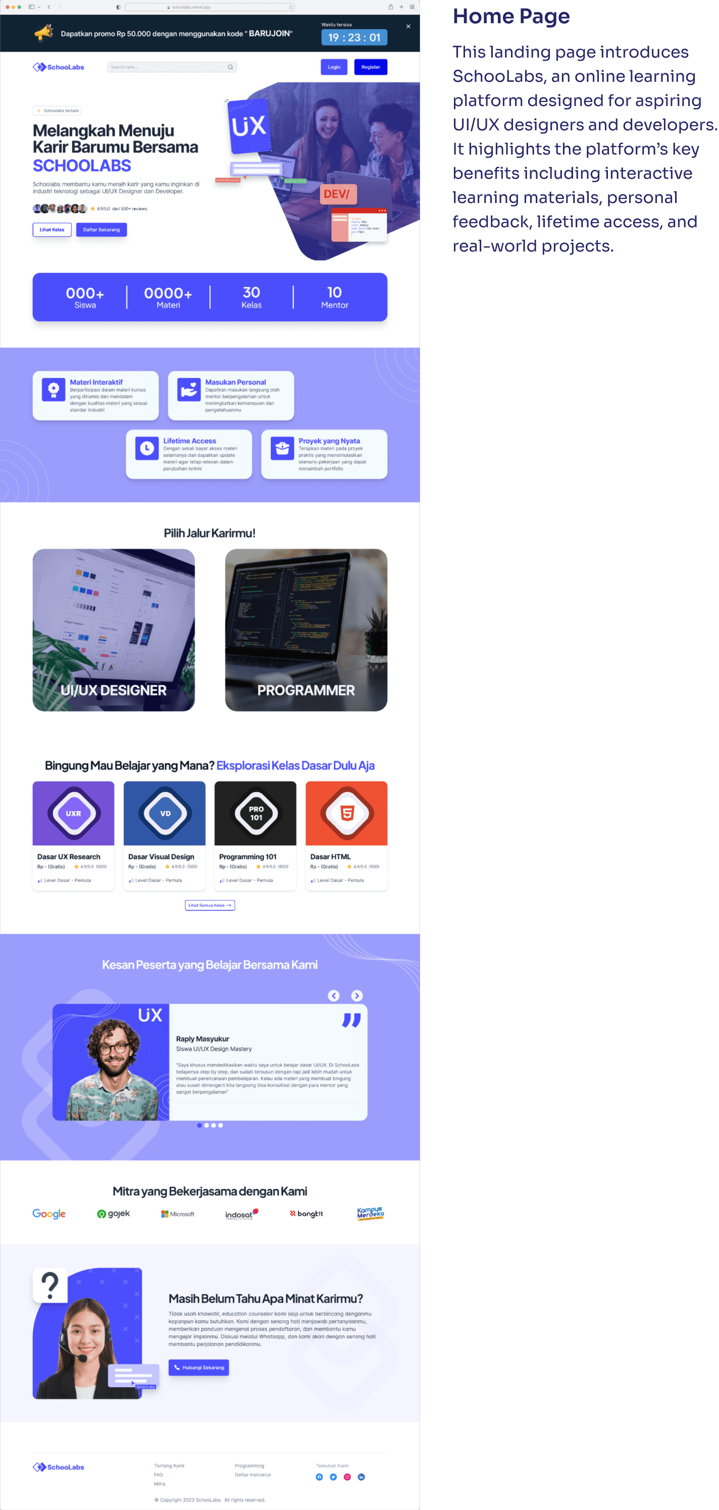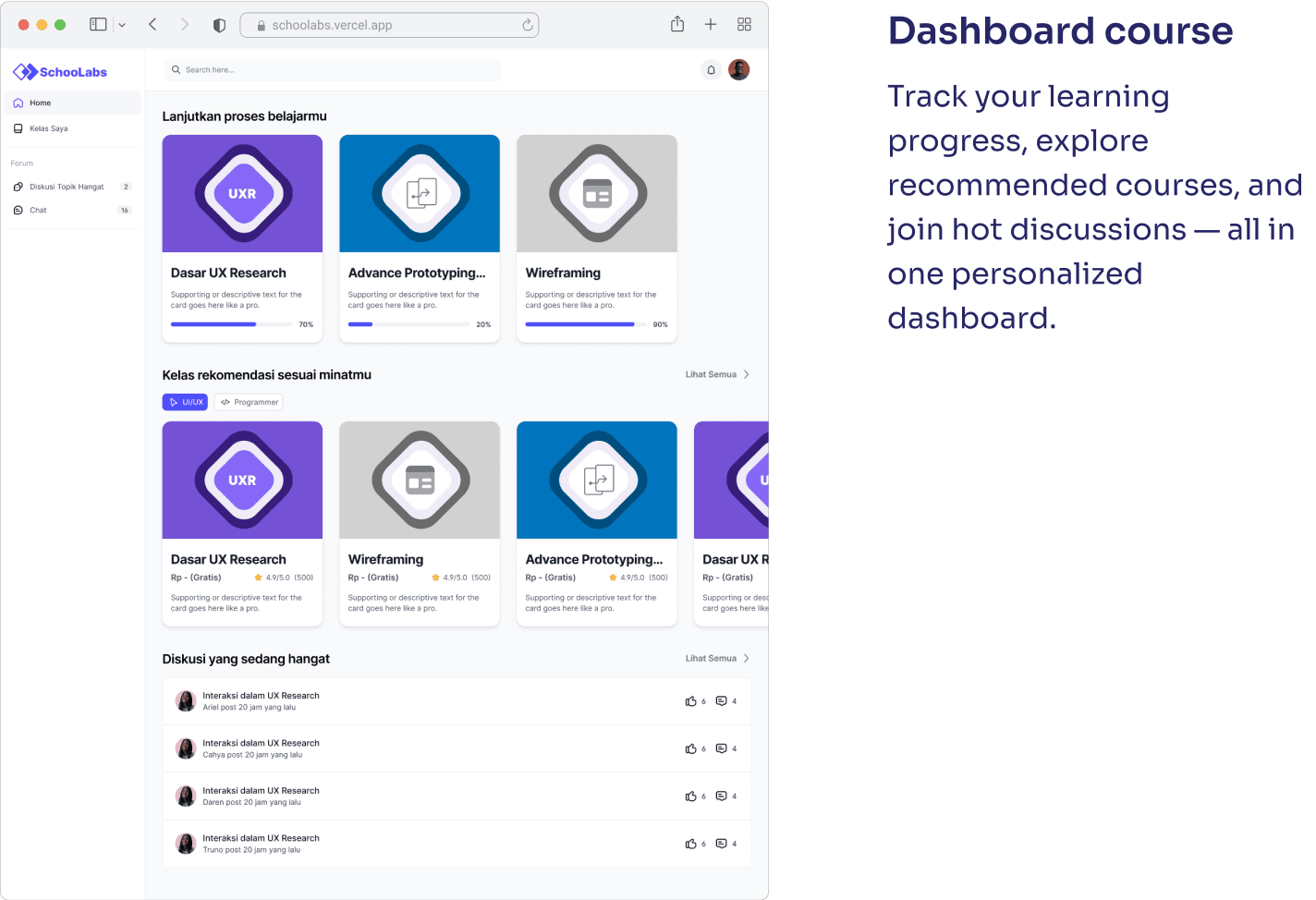 Schoolabs successfully launched as a learning platform for both designers and developers, offering structured, hands-on courses in UX, UI, and coding. With features like progress tracking, assignment submissions, and community discussions, the platform encourages active, project-based learning.