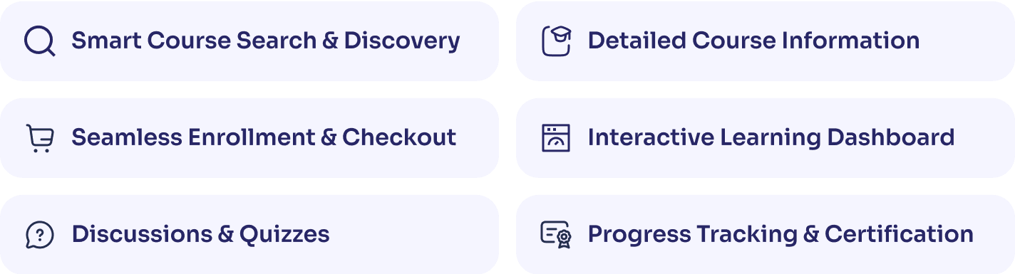 Implement a clean layout with smart filtering, search functionality, and personalized recommendations to help users discover and enroll in courses effortlessly.
